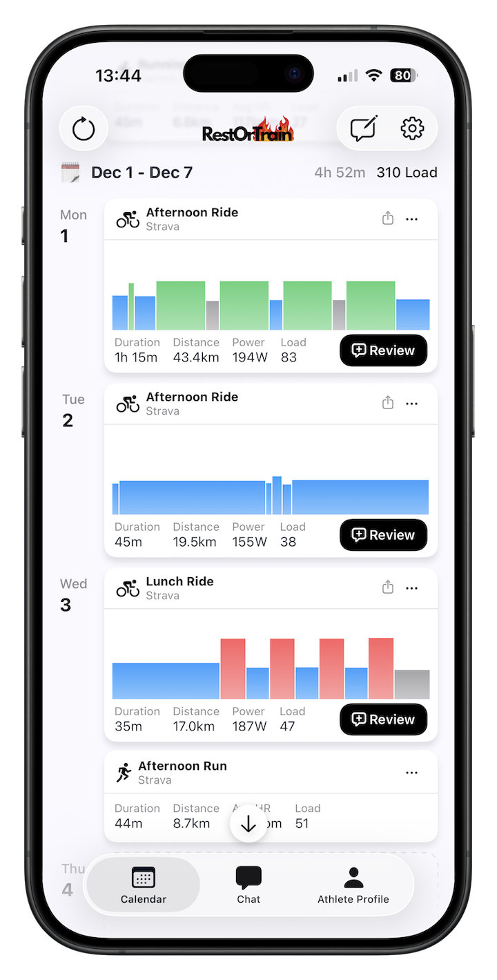 "I tried using ChatGPT for training plans, but it was often imprecise, and a coach was too expensive. Then I found RestOrTrain and I fell in love. It's smart, flexible, and lets me choose my own goals while balancing performance and recovery. Honestly, this feels better than a coach in some ways."